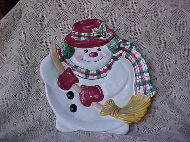 This is a cookie dish by Fitz and Floyd in the shape of a snowman. It has two small holes in the back to be used for the placement of a hangar. It is in excellent condition; no chips, cracks or repairs. He is a wearing wine colored hat and gloves. The hat has a green and wine plaid hatband with holly leaves and gold berries. The gold on the berries is slightly worn. He is wearing a green and wine plaid scarf around his neck and green earmuffs, and is carrying a straw broom. It is marked "Fitz and Floyd Essentials, Made in China". It measures 8-1/4" wide, 9-1/2" from top to bottom. Perfect for your holiday table.