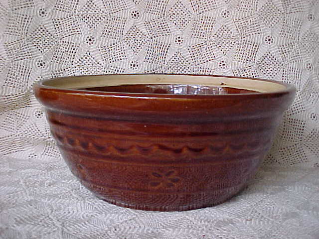 A nice bowl by Marcrest in the "Daisy & Dot" pattern. It is in the dark brown glaze. It is in excellent condition; no chips, cracks, hairlines, or repairs. It is missing the lid. It measures 8-1/2" in diameter and 3-3/4" tall. It is marked "Marcrest Stoneware, Oven Proof".