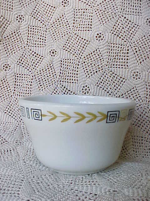A nice soup bowl by Shenango in pattern number "SHO72". It has a white background with gold leaves and a key design around the outer edge. It is in excellent condition; no chips, cracks, hairlines, or repairs. It measures 3-3/4" in diameter and 2-1/2" tall. It is marked "Shenango China, New Castle, PA., USA,Anchor Hocking, C Y-39".