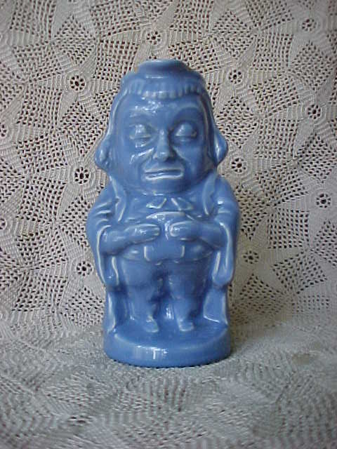 This is a "Toby" creamer. He is carrying a book. It is a light blue with accents of white. It does have two small chips on each side of the spout and a hairline about 3/4" long close to one of the chips. Otherwise it is in very good condition. There is a mark, but it is too pale to read. It measures 5" tall, 2-1/2" in diameter at the base.