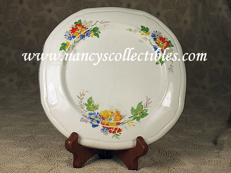 An Alfred Meakin tea/teapot stand c 1907+. It is decorated with orange, yellow, and blue flowers and trimmed in gold. It is in excellent condition; no chips, cracks or repairs. Some of the decora- tion is worn from use. It measures 6-3/4" wide. It is marked on the bottom "Alfred Meakin, England".