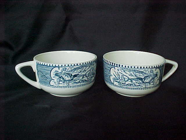 A pair of cups in the Currier & Ives pattern in blue and white. They are both in excellent condition; no chips, cracks, or hairlines. The picture is of a woman in a two horse-drawn buggy. They measure 3-1/2" in diameter, 2-1/8" tall. They are unmarked.