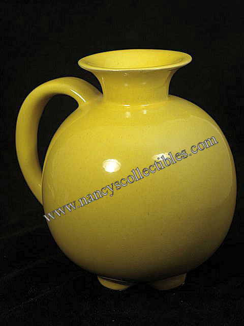 A vintage 6-cup carafe made by Frankoma. It is in excellent condition. It is bright yellow and measures 7" tall, 7-1/4" wide at its largest point, including the handle. It is marked "Frankoma 82". It is dated 1958.