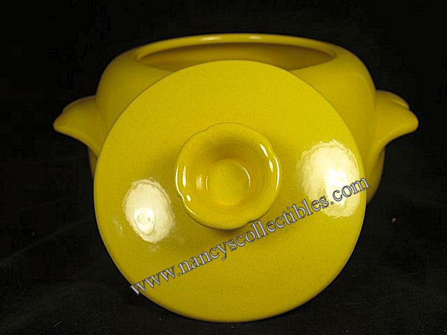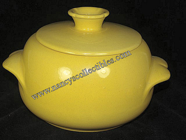 A vintage casserole with lid made by Frankoma. Except for a small chip under the lid, it is in excellent condition. It is bright yellow and measures 6" tall including lid, 9-1/4" wide including handles. It is marked "Frankoma 4V". It is dated 1967.