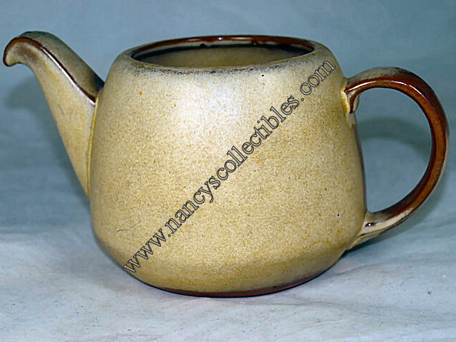 A vintage six cup teapot from the Frankoma "Westwind" in dinnerware. It is in excellent condition. It is missing its lid. It measures 4-1/2" tall; 9-1/2" wide, handle to spout. It is marked "6T, Frankoma". It is dated 1964.