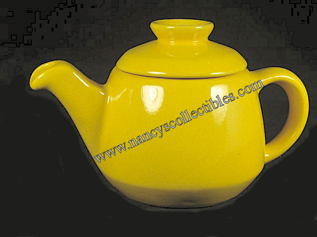 A vintage two cup teapot from the Frankoma "Westwind" in dinnerware in autumn yellow. It is in very good condition. The lid has three small chips, only one of which can be seen and the pot has a small flaw which is covered by lid. It measures 4-1/4" tall, including the lid; 7" wide, handle to spout. It is marked "6J, Frankoma". It is dated 1965.