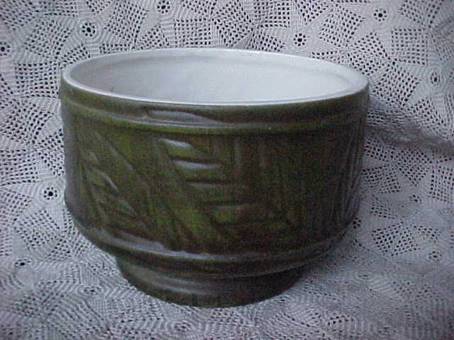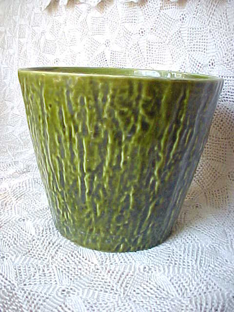 A nice planter made of a dark green pottery. The maker is unknown and is unmarked. It has a pattern that resembles the bark of a tree. It is in excellent condition; no chips, hairlines, or repairs. It does have a manufacturing flaw at the bottom where the drain hole is. It measures 4-1/2" tall, 5-1/2" in diameter at the top, and 3-1/2" in diameter at the base.