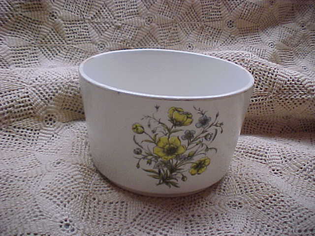 A small planter by J & G Meakin. It is in excellent condition; no chips, cracks or repairs. It is white with a bouquet of yellow and blue flowers decorating both sides with gold trim at the top. It measures 2-3/4" tall; 4-1/4" in diameter at the top; and 3-3/4" in diameter at the base. It is marked incised on the bottom "J & G Meakin, England" .