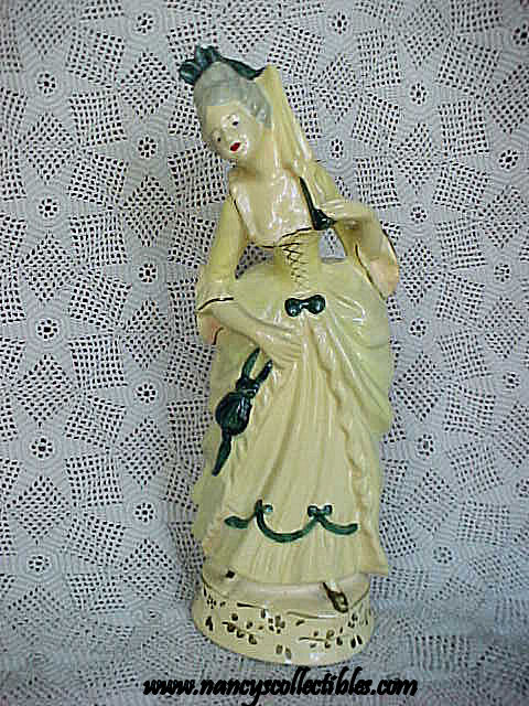 This is a chalkware figurine of a Victorian Lady. She is in a yellow gown trimmed in green and gold. She is carrying a green bag and an umbrella with a green handle standing on a yellow base trimmed in gold. She has a green bow in her grey hair. She is in very good condition; with a chip in the bow and a small paint chip on the base. There are no cracks, or repairs. It is unmarked. She measures 9-1/2" tall.