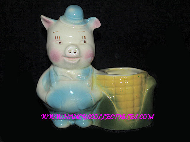 This is a planter of a pig standing next to a corn- cob. He is wearing a white shirt under pale blue overalls and a blue bowler hat. His hands are in the pockets of his overalls. He is in excellent condi- tion; no chips, cracks, or repairs. It is unmarked. It measures 6" tall; 5" wide.