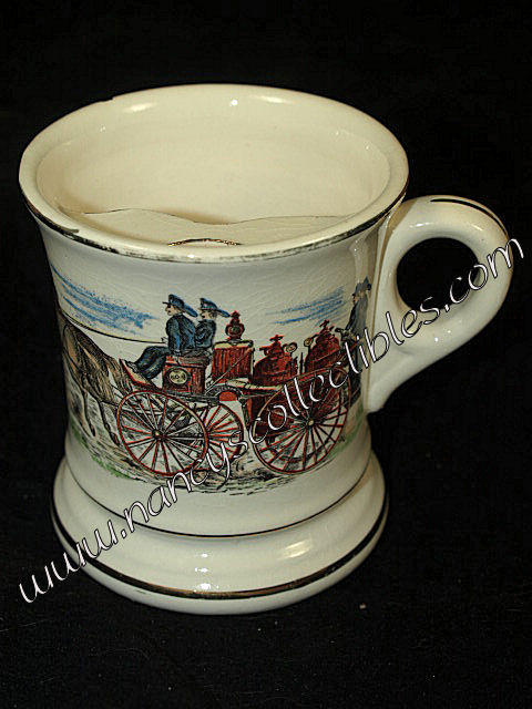 A mustache mug decorated with firemen on a horse drawn fire wagon. It is trimmed in gold on the top edge, handle, base and inside. Some of the gold is worn from use and there is a chip on one outer edge. It is in very good condition; no cracks, hairlines, or repairs. It measures 4" tall; 3-1/4" in diameter. It is marked on the bottom "Americana" .