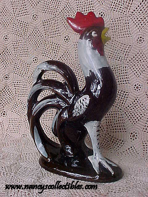 A wonderful crowing rooster figurine. He has brown feathers accented in white. He has a bright red comb. white feet, and yellow beak. He is in very good condition; one chip on his comb, no cracks, or repairs. He measures 3-3/4" wide, 6-1/4" tall. There is some sticker residue, but wording is unreadable. Therefore, maker is unknown. A great collectible for your rooster collector!