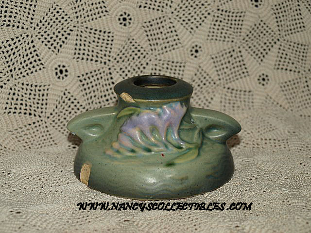 A Roseville candleholder in the "Freesia" pattern. It is in very good condition; it has three small chips; one on the base and two on the top edge. There are no cracks or repairs. It is green with a orchid colored freesia. It measures 2" tall; 3-1/2" in diameter at the base. It is marked on the bottom "Roseville U.S.A, 1160-2". It is dated 1945.