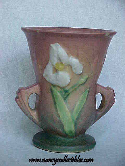 A small Roseville vase. It is in the "Iris" pattern. It is in very good condition; it has three small chips on the lip, some crazing, no cracks, or repairs. It is mauve with a yel- low throated white iris. It measures 4" tall; 3-1/4" in diameter at the top; and 2-1/4" in diameter at the base. It is marked on the bottom "Roseville, 914-4" . It is dated 1939.