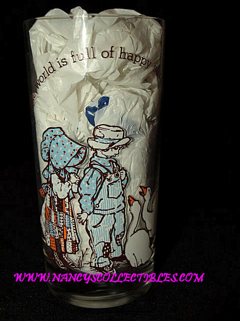 A "Holly Hobbie" glass by A.G.C.(American Greetings Corporation). On the front of the glass is Holly Hobbie dressed in a blue bonnet and a patchwork apron with a friend looking down at two geese. Below the picture is "The World Is Full Of Happy Surprises". It is in excellent condition; colors are bright, no chips or scratches. It is marked "American Greetings Corp, 1978,Holly Hobbie". It measures 5-1/2" tall; 2-1/4" in diameter at the base.