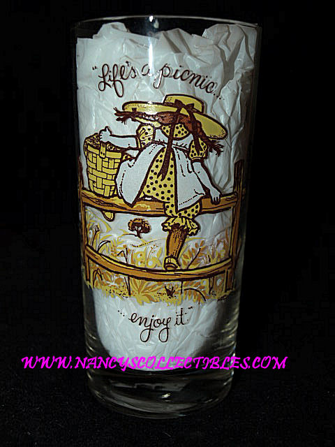 A "Holly Hobbie" glass by A.G.C.(American Greetings Corporation). On the front of the glass is Holly Hobbie in pigtails, dressed in a white apron over a yellow dotted dress and wide-brimmed yellow hat. She is climbing over a wooden fence carring a picnic bas- ket. Below the picture is "Life's A Picnic...Enjoy It". It is in excellent condition; colors are bright, no chips or scratches. It is marked "A.G.C.,Holly Hobbie". It measures 5-1/2" tall; 2-1/4" in diameter at the base.