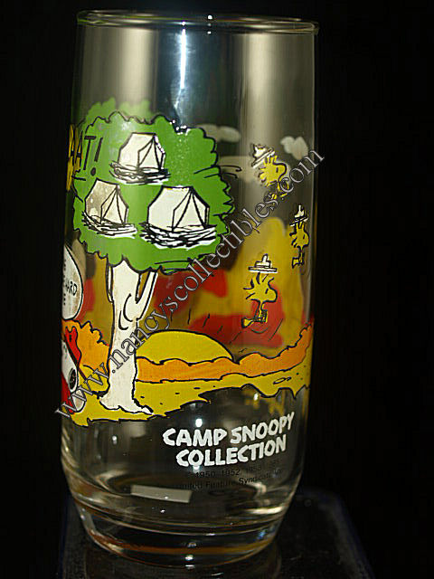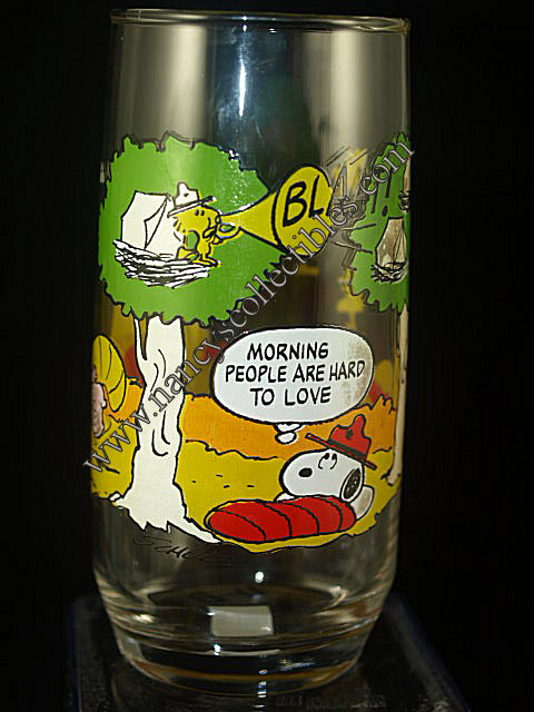 A McDonald's "Camp Snoopy Collection" glass. Snoopy is in his sleeping bag. He is saying "Morning People Are Hard To Love" while Woodstock is blowing a horn above him. It is in excellent condition; no chips or scratches. Colors are bright. It is marked "McDonald's, Camp Snoopy Collection,1950, 1952, 1958, 1965, 1968, United Feature Syndicate, Inc". It measures 6" tall; 2-1/2" in diameter.