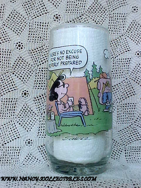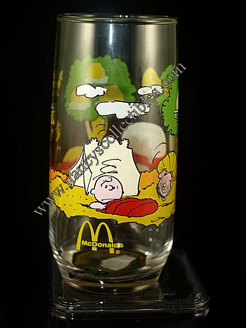 A McDonald's "Camp Snoopy Collection" glass. Lucy is relaxing in a camp chair sipping on a drink. She is saying "There's No Excuse For Not Being Properly Prepared". It is in excel- lent condition; no chips or scratches. Colors are bright. It is marked "McDonald's, Camp Snoopy Collection,1950, 1952, 1958, 1960, 1965, 1968, United Feature Syndicate, Inc". It mea- sures 6" tall; 2-1/2" in diameter.