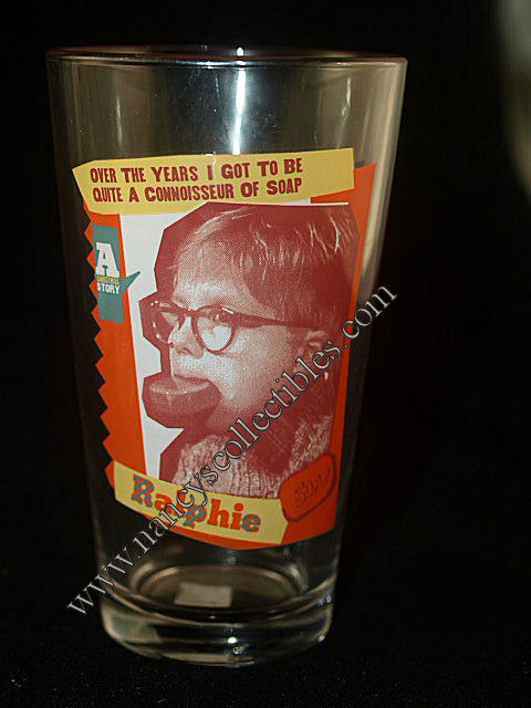 A "Ralphie" glass by Turner Entertainment from the movie "A Christmas Story". On the front of the glass is a picture of Ralphie with "Over The Years I Got To Be Quite A Connoisseur Of Soap" printed. On the back is "A Christmas Story" printed. It is in excellent condition; colors are bright, no chips or scratches. It is marked "TM & Turner Entertainment". It measures 6" tall; 3-1/2" in diameter at the top.