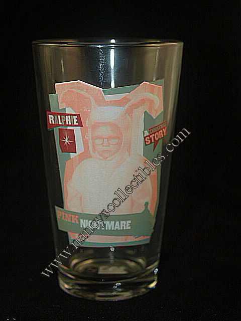A "Ralphie" glass by Turner Entertainment from the movie "A Christmas Story". On the front of the glass is a picture of Ralphie with "Nightmare" printed with Ralphie dressed in a rabbit suit. On the back is "A Christmas Story" printed. It is in excellent condition; colors are bright, no chips or scratches. It is marked "TM and Turner Entertainment". It measures 6" tall; 3-1/2" in diameter at the top.