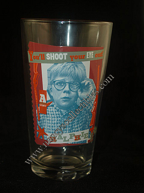 A "Ralphie" glass by Turner Entertainment from the movie "A Christmas Story". On the front of the glass is a picture of Ralphie with "You'll Shoot Your Eye Out!" printed. On the back is "A Christmas Story" printed. It is in excellent condition; colors are bright, no chips or scratches. It is marked "TM and Turner Entertainment". It measures 6" tall; 3-1/2" in diameter at the top.