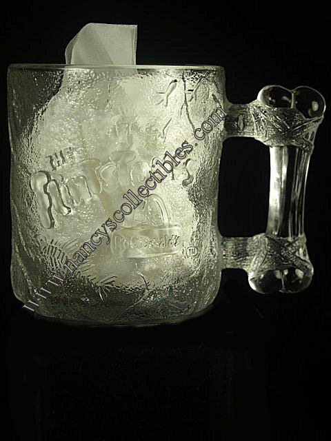 A McDonald's "RocDonald's - The Flintstones-PreDawn" mug. It is clear glass with "The Flintstones-RocDonald's" imprinted on the mug and decorated with shells, leaves and branches. The handle is made to look like a bone. It is in excellent condition; no chips or scratches. It is marked "McDonald's, Pre-Dawn Mug, The Flintstones, Made in U.S.A.,1993, McDonald's Corp.". It measures 3-1/2" tall; 4-1/2" including the handle.
