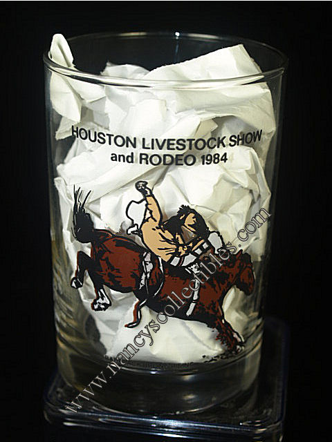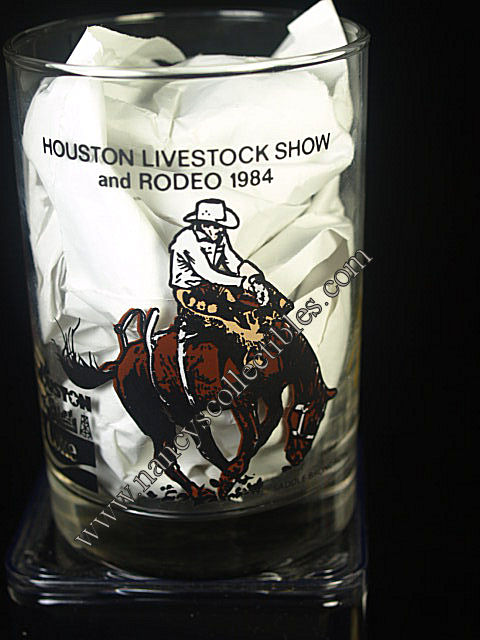 A McDonald's Collection Series glass of the 1984 Houston Livestock Show and Rodeo. It is the first in a series of four. It shows bareback bronc riding and saddle bronc riding. It is in excellent condi- tion; no chips or scratches. Colors are bright. It is marked "Second Edition Series, McDonald's Collector Series 1984, First in a Series of Four, 1984 McDonald's Corporation". It measures 5" tall; 3" in diameter.
