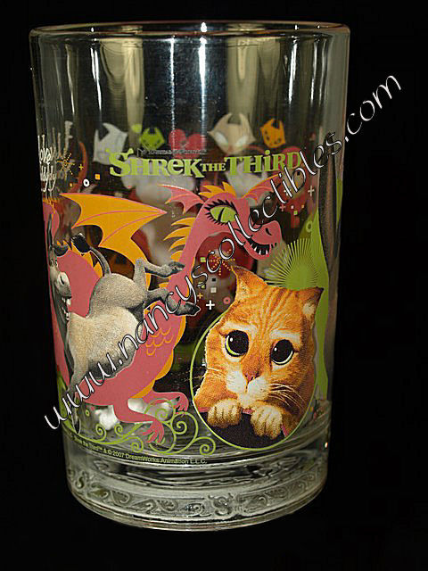 A McDonald's Shrek glass. On the front it states, "Shrek the Third". On one side it states, "Beware Ogres". It is in excellent condition; colors are bright, no chips or scratches. It is marked "2007, McDonald's, Shrek the Third,Dreamworks Ani- mation". It measures 5" tall; 3-1/4" in diameter.