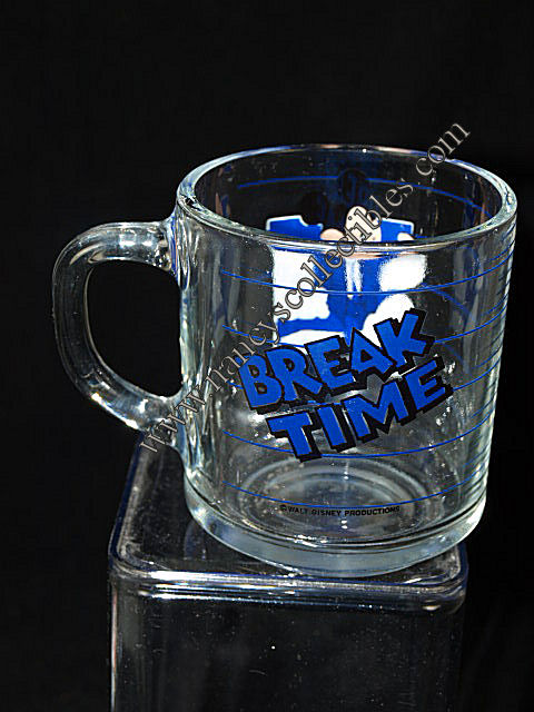 A Disney Mickey Mouse glass by Anchor Hocking. On the front is a picture of Mickey Mouse sitting on the corner of his desk eating a donut. It's Break Time! On the back of the mug "Break Time". It is in very good condition; colors are bright, no scratches. There is a tiny chip on the top edge. The Anchor Hocking mark is imprinted on the bottom. It measures 3-1/2" tall; 3" in diameter at the base.