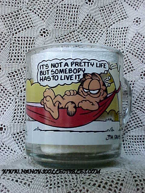 A McDonald's Garfield glass mug. On the front it states, "It's Not A Pretty Life, But Somebody Has To Live It". It is in excellent condition; colors are bright, no chips or scratches. It is marked "1978,McDonald's, Garfield Characters: United Fea- ture Syndicate, Inc." signed by Jim Davis. It measures 3-1/2" tall; 3" in diameter.