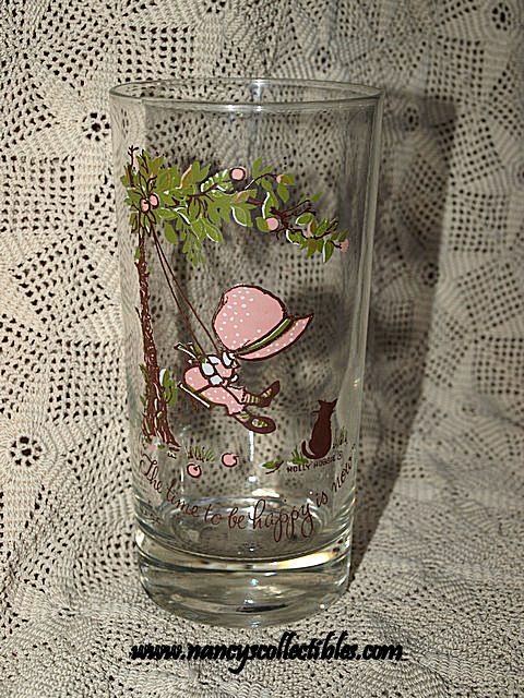 A "Holly Hobbie" glass by A.G.C.(American Greetings Corporation). On the front of the glass is Holly Hobbie dressed in pink swinging from a tree limb with a cat on the ground. Below the picture is "The Time To Be Happy Is Now". It is in excellent condi- tion; colors are bright, no chips or scratches. It is marked "A.G.C.,Holly Hobbie". It measures 5-1/2" tall; 2-1/4" in diameter at the base.