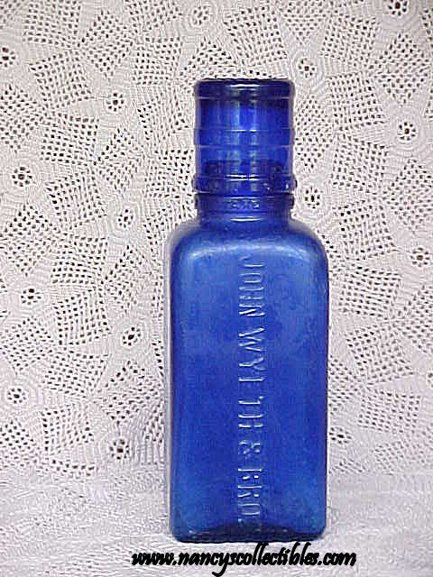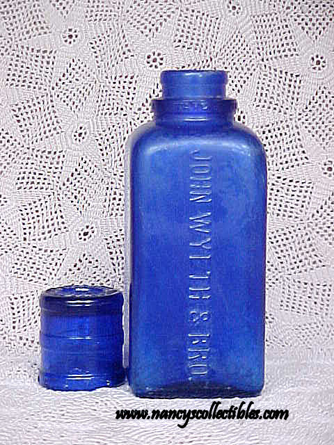 A cobalt blue Wyeth Medicine Bottle with a plastic eyecup. It is in excellent condition; no chips or cracks. The eyecup screws onto the bottle and does have cracks where it screws on. It is marked on the eyecup "Wyeth". The bottom reads either a "6" or a "9", not sure which it is. It measures 5-3/4" tall; 2" square.