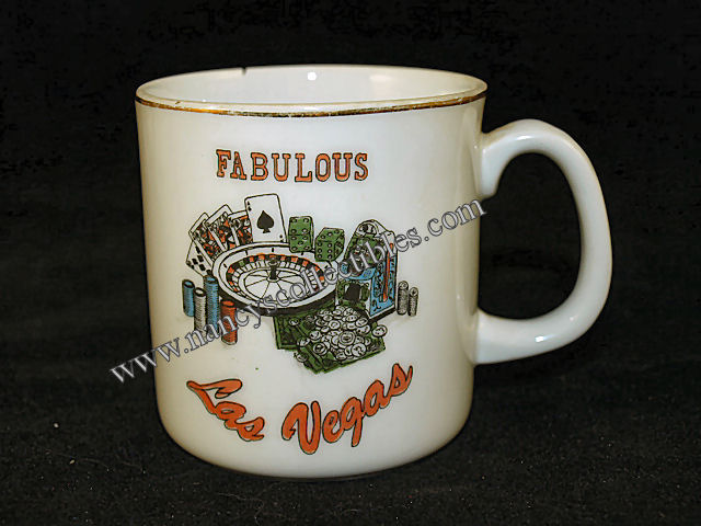 A souvenir "Fabulous Las Vegas" Mug. It is white with "Fabulous Las Vegas" pinted in red. There is an image of dice, playing cards, roulette wheel, coins, chips, and a "one armed bandit" and decorated with flowers on each side. The handle and top edge is brown, trimmed in gold. It is in excellent condition; no chips, cracks, or hairlines. It measures 3-1/4" tall; 3" in diameter.