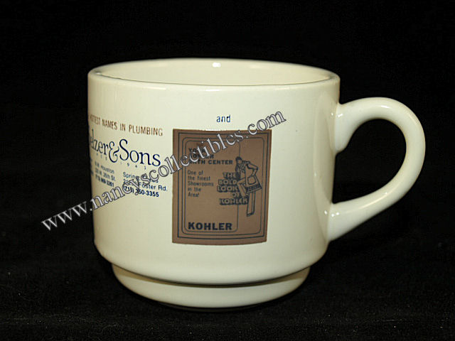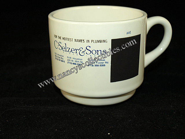 This is an advertising mug from C. Seltzer & Sons. A plumbing supply company in Houston and Spring, Texas. The company is still in existence and dates from 1943. It is white with blue print with a heat-activated image. It is in excellent condition; colors are bright, with no chips or scratches. It measures 3" tall; 3" in diameter.