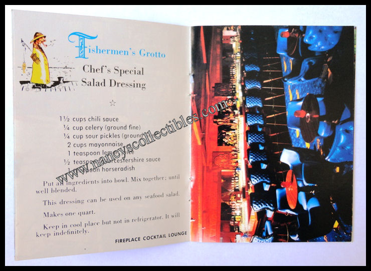 This 3.75" X 5" vintage, souvenir Recipe Booklet is in very good condition; no marks, tears or stains. It appears to be printed on light weight photo paper and the quality of the photos and print is very good. There is black print on white paper. The photos and print do not show as well as they should. There are 12 inside pages. There are 5 color photos of the inside of the restaurant and the back cover shows a photo of the outside. There are 2 pages of "Facts About the Wharf." There are Four Recipes and a 2 page map of it's location. The last two inside pages are advertisements. "No 9 Fishermen's Grotto. Three Dining Rooms with a View of the Fishing Fleet and San Francisco, Fireplace Cocktail Lounge, and Venetian Atmosphere maintained in the Family Tradition. Owned and Operated by M. Geraldi & Sons; location and phone numbers." A very nice souvenir and mini Recipe Booklet.