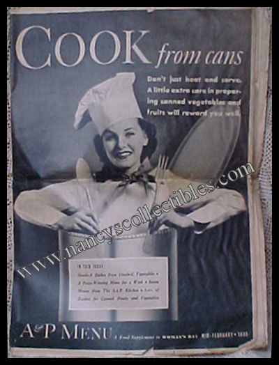 This is an A & P Menu Supplement booklet titled "Cook From Cans". It is dated Mid- February, 1938 and is 16 pages full of recipes for everyday of the week. There are also many ads that you will recognize from the past and the present. It is made of newspaper quality paper, therefore it is brittle and does have some tears and folds when it was stored. There are also stains from use. It is still a great collectible and fun to read the cooking practices of that time period.