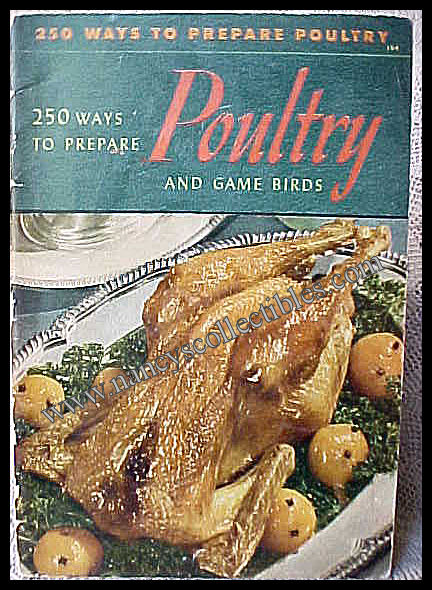 This is a booklet published by the Culinary Arts Institute. It is titled "250 Ways To Prepare Poultry and Game Birds". It includes 21 recipes for roasted and baked chicken, broiled chicken, stewed chicken, fried chicken, creamed chicken, chicken casserole, pies and shortcakes, chicken loaves, salads, chicken sandwiches, poultry livers, ducks, geese, turkeys, pigeons and squabs, game, and miscellaneous other poultry type recipes. The copyright date is 1940 by Consolidated Book Publishers, Inc. It is in very good condition; no stains or markings. It does have one tear on the back cover and the front cover is worn on the binding. A great collectible with some yummy ideas.