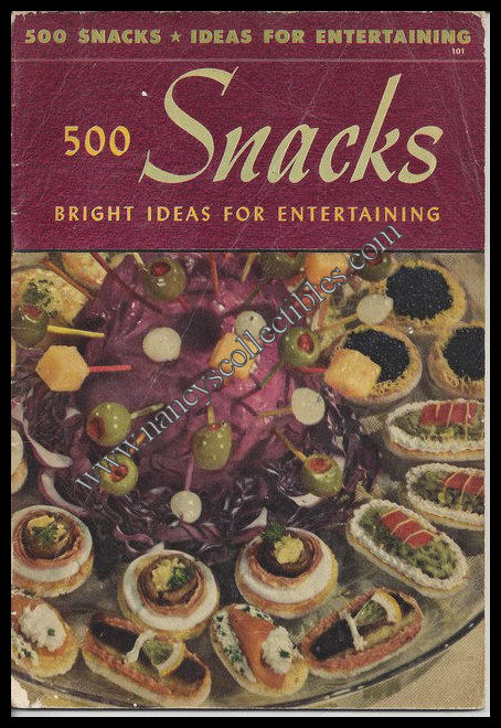 A recipe cook book for entertaining snacks. The title is "500 Snacks-Bright Ideas For Entertaining". There are recipes for bread & pastry snacks, cold and hot canapes, sandwiches & spreads, cold and hot hors d'oeuvres, hot and cold entrees, salad bowls, salad plates, frozen salads, sweet snacks, garnishes and displays. It is marked,"Copyright 1940,Pub- lished by Culinary Arts Institute,Consolidated Book Publishers, Inc.". It is in very good condition; all pages are intact, no stains or tears. The cover has some creases and the binding is worn. This is a 48- page book.