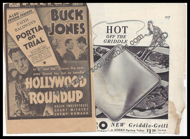 This is a vintage page from a magazine. It has a recipe for Boston brown bread. The ad on the back(showing) is for a Mirro Griddle/Grill. The other recipe is from a newspaper. The recipe is for "Pudding Candy", Tropical Lamb Chops, and Steamed Pudding. On the back (showing) is an ad featuring the movies "Portia On Trial", and "Buck Jones - Hollywood Roundup". They opened in 1937. The Boston Brown Bread recipe is in good condition. The edges are ragged and some staining from use. The candy and pudding recipe is in very good condition. It does have a small tear at the bottom and has a crease at the top and small stain.