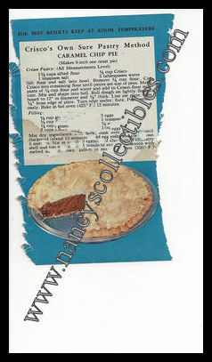 This is a vintage recipe from a Crisco container. It has a recipe for "Caramel Chip Pie" and the original Crisco Pie Pastry. The recipe is in good condition. The edges are ragged where they were cut from the container and there is some staining from use. The recipe is not complete in the pic- ture, but is complete on the original cut-out when received. Date unknown.
