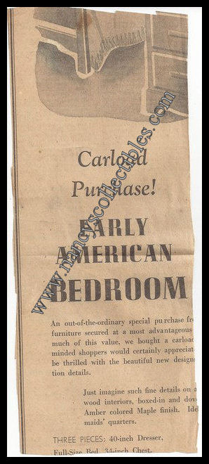 These are vintage recipes from a newspaper. It has a recipes for "Ice Box Cookies", "Date Cookies", "Butterscotch Cookies", "Sour Milk Cookies", and "Chocolate Brownies". The ad on the back(showing) is for Early American Bedroom furniture. It is in good condition. The edges are worn, some creasing and some staining from use. Dates unknown.