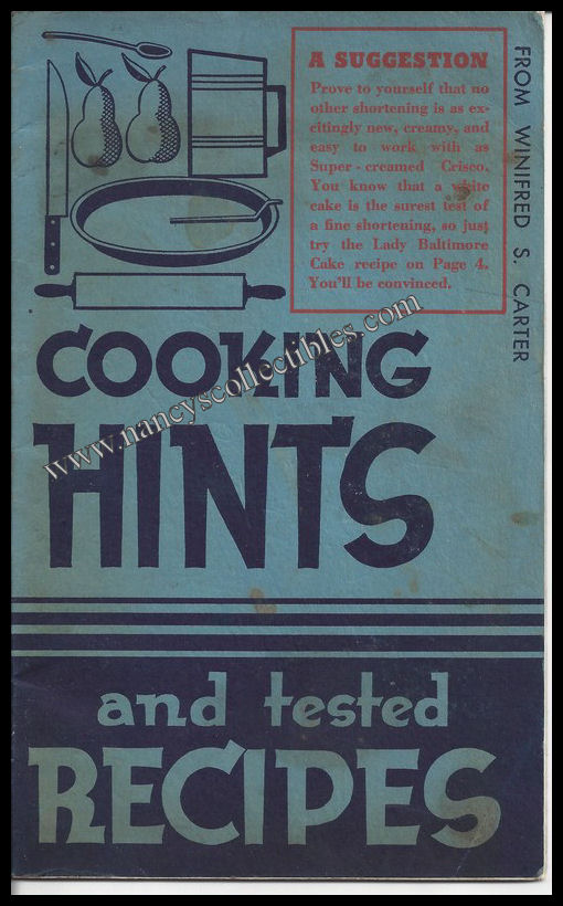 A recipe cook book for cakes, cookies, waffles, muffins, pastry, and frying using Crisco. There are also tips and advice for each process. It is marked "Copyright 1937, Procter and Gamble Company,Cincinnati, Ohio". It is in very good condition; all pages are intact, no tears. The front cover has some stains as well as the first page. This is a 32-page booklet.