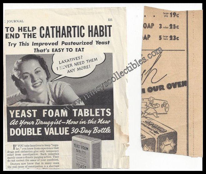 This is a vintage page from a magazine. It has a recipe for a gingerbread dessert using Brer Rabbit's Molasses. The ad on the back(showing) is a medicinal product "Yeast Foam Tablets". The other recipe is from a newspaper. The recipe is for "Christmas Fruit Cake". On the back (showing) is a partial grocery ad for soap. The gingerbread recipe is in good condition. The lower edge is torn, creases, and some staining from use. The Christmas fruit cake recipe is in very good con- dition. It does have a crease on the bottom. Dates unknown.