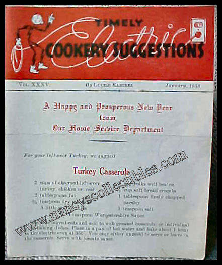 This is a leaflet by the Washington Water Power Company. It is titled "Timely Cookery Suggestions". It includes 5 post-holiday recipes for Turkey casserole, Tomato Sauce, Cranberry Sauce with Caramel Apples, Old Fashioned Cherry Cake, and Prune Whip Pie. It is dated January, 1938. It is in excellent condition; no tears, markings, or stains.