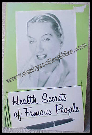 This is a booklet titled "Health Secrets of Famous People". It includes facts and nutrition of famous people from Henry VIII to Red Buttons. It also includes medical practices during the Louis XIV period and the medical history of George Washington. The copyright date is 1961 by J.I. Rodale Books, Inc. It is in excellent condition; no tears, stains, or markings. The front cover does have a place in the upper right corner where a label was removed.