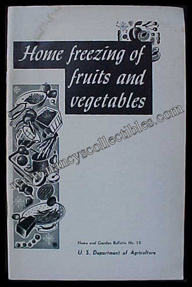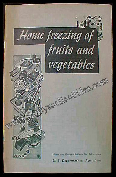This is a recipe book supplied by the U. S. Dept. of Agriculture. This is a 48-page book which gives the directions and tips for the freezing of fruits and vegetables. A really good book to have for someone that likes to buy in bulk or has their own garden. It is in very good condition; all pages are intact and there are no tears. The front and back covers are yellowed at the binding from age. The last 12 pages have holes from being stapled at the top, bottom, and center of the pages. It is marked, "U. S. Government Printing Office: 1957". The front cover is marked, "Home and Garden Bulletin No. 10, revised, U. S. Department of Agri- culture.