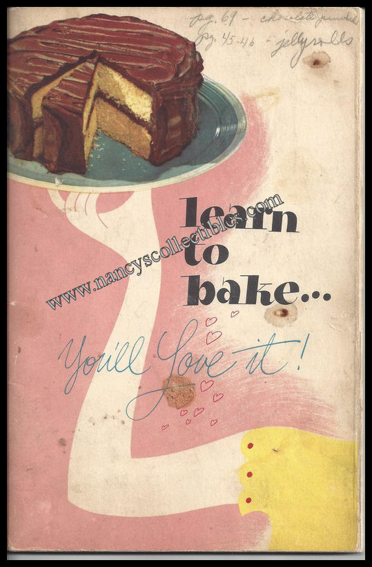This is a recipe book by General Foods Corporation. It is a instructional and recipe book on baking muffins, pies, pastry, puddings, quick breads, sauces and fillings, cakes, and sponge cakes. Instructions on measurements and weights, measuring, ingredients, baking pans, tips, baking time tables, and decorating. It is in very good condition; all pages are intact and there are no tears. There are stains on the cover and pages from us. There are hand-written notations on the cover. It is marked "General Foods Corporation, Consumer Service Department, 250 Park Ave., New York, N.Y.,Copr 1947, Ptd. in U.S.A., 2nd Ptg.". This is a 80-page book.