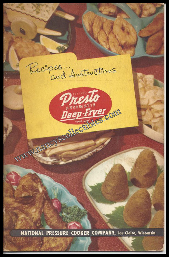 This is a cook book for the Presto Automatic Deep Fryer. It includes operating instructions and recipes for appetizers, vegetables, fish and seafood, chicken and meat, fritter, croquettes, doughnuts and desserts. It is copyrighted 1952, N.P.C. Co., Printed in U.S.A. It is in excellent condition; no tears or stains.