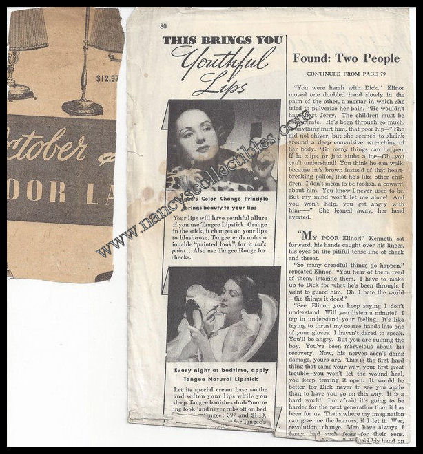 This is a vintage page from a magazine. It has a recipe for "Magic Chocolate Frosting". The ad on the back(showing) is for Tangee Lipstick. The other recipe is from a newspaper. The recipe is for "Pumpkin Pie" and "Ice Box Cookies". On the back (showing) is an ad for table and floor lamps. It is showing one of the lamps for $12.97. The "Magic Chocolate Frosting" recipe is in good con- dition. The edges are worn, some creasing and some staining from use. The pumpkin pie recipe is in good condition. It does have a small tear at the top and has a small stain. Dates unknown.