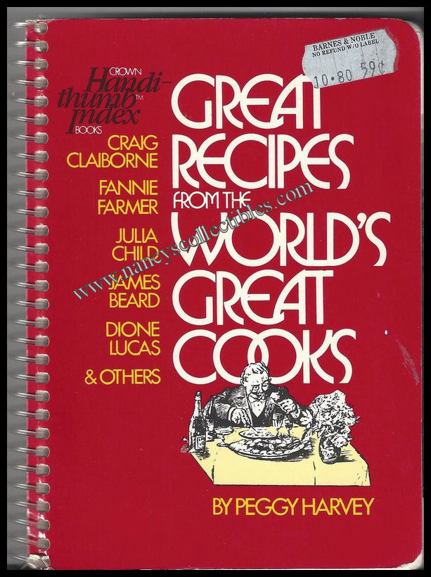 A recipe book by Crown Books covering recipes from Craig Claiborne, Fannie Farmer, Julia Child, James Beard, Dione Lucas and many others. It is a spiral- bound book. There is a wide range of recipes, from appetizers, soups, salads, entrees, to desserts. It is marked "Copyright MCMLXIV, by Peggy Harvey, Gramercy Publishing Company a division of Crown Publishers, Made in U.S.A.". It is in excellent condi- tion; all pages are intact, no missing pages, no stains or tears. This is a 191-page book.